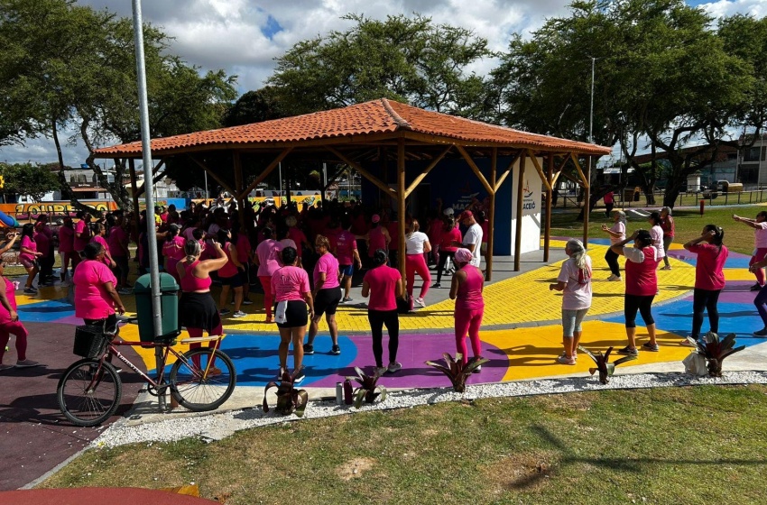 Profissionais dos Núcleos de Atividades Físicas(NAFs) promoveram nessa quarta-feira(22) mais um aulão alusivo à campanha do Outubro Rosa, com atividades de prevenção ao câncer de mama. As ações foram realizadas no NAF do Osman Loureiro, parte alta da cidade e levaram informação e conscientização para cerca de 100 usuárias. A mobilização levou atividades físicas como dança, alongamento, caminhada para as usuárias, além de realizar dinâmicas sobre a importância da prevenção e do autocuidado com a adoção de hábitos saudáveis para evitar a doença. “Nossa ação buscou reforçar a importância do autocuidado, da realização da mamografia, da alimentação saudável e das atividades físicas como forma de prevenção ao câncer de mama e outra série de doenças. Esse momento é muito importante para criar esse elo com a comunidade para que as ações sejam contínuas, lembrando que a prevenção deve ser o ano inteiro”, destaca Reinaldo Alves, responsável técnico pelos NAFs. Participaram das atividades usuários dos Núcleos da parte alta da cidade, como Osman Loureiro, Fernão Velho, Salvador Lyra, Eustáquio Gomes, Novo Jardim, Canaã, Santo Amaro.